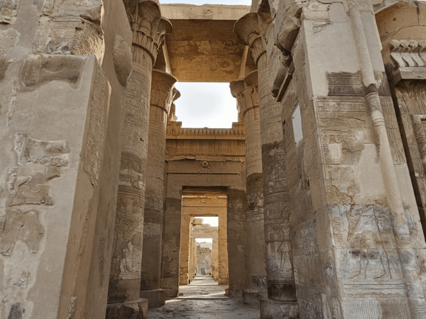The Edfu Temple, dedicated to Horus, is one of Egypt’s best-preserved temples, built during the Ptolemaic period , it features a massive pylon, an impressive courtyard, columns, and detailed hieroglyphics depicting Horus' battle with Seth. The temple was a major religious center and is renowned for its architectural grandeur and historical significance.